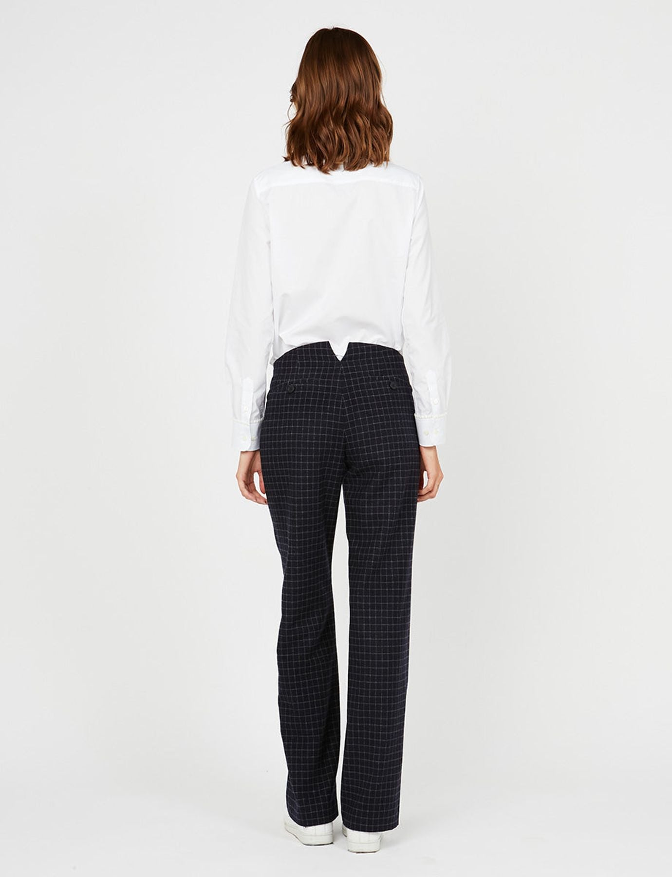 I pantaloni di lana Gabriel a quadri blu navy ed ecru sono tanto eleganti quanto comodi, con un taglio "a ponte" dritto e morbido senza tempo e una cintura con bottoni che li rende i preferiti dalle donne di tutto il mondo.