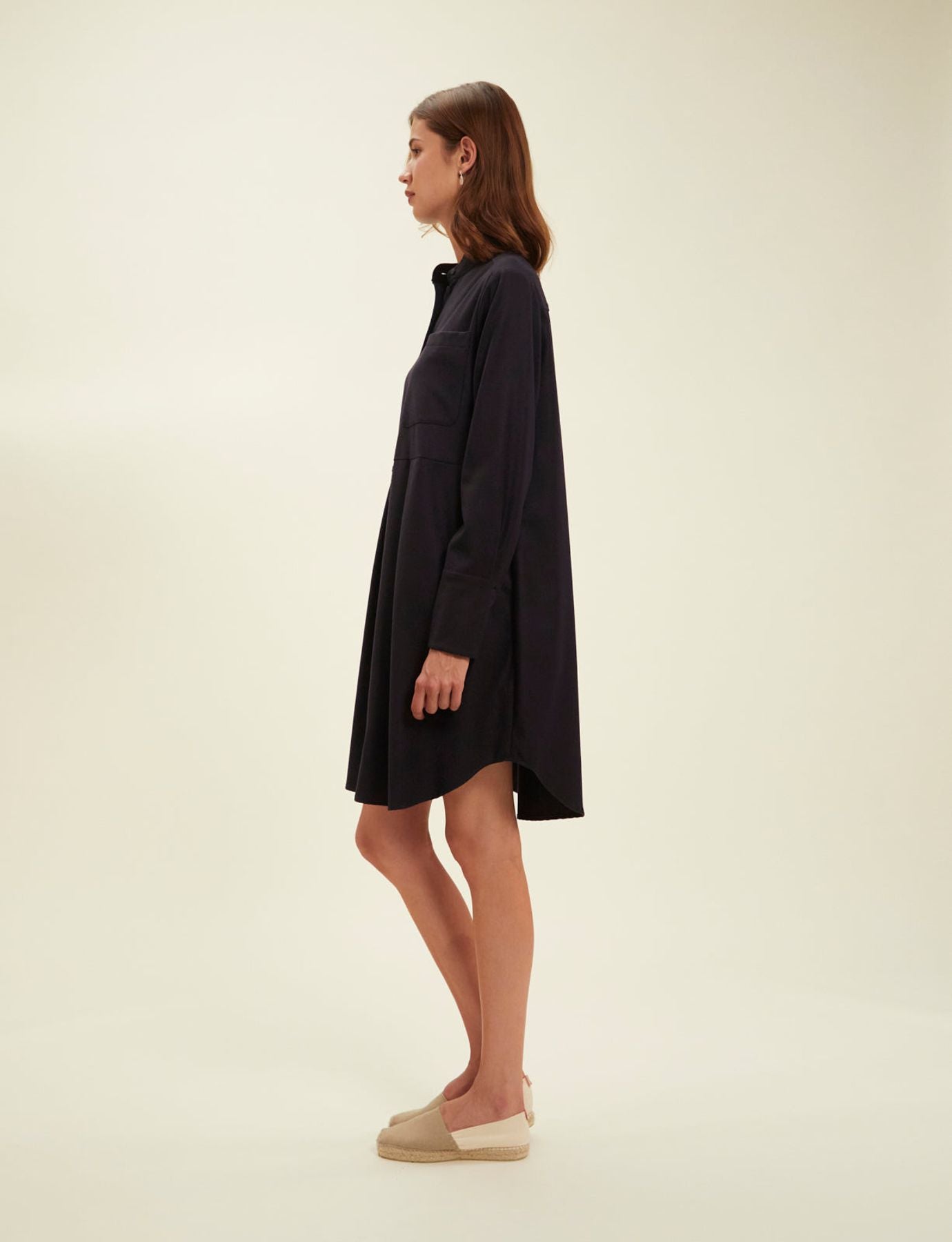 Découvrez la nouvelle robe chemise Martina bleu marine. Cette pièce en laine vierge est agrémentée d'un col officier.